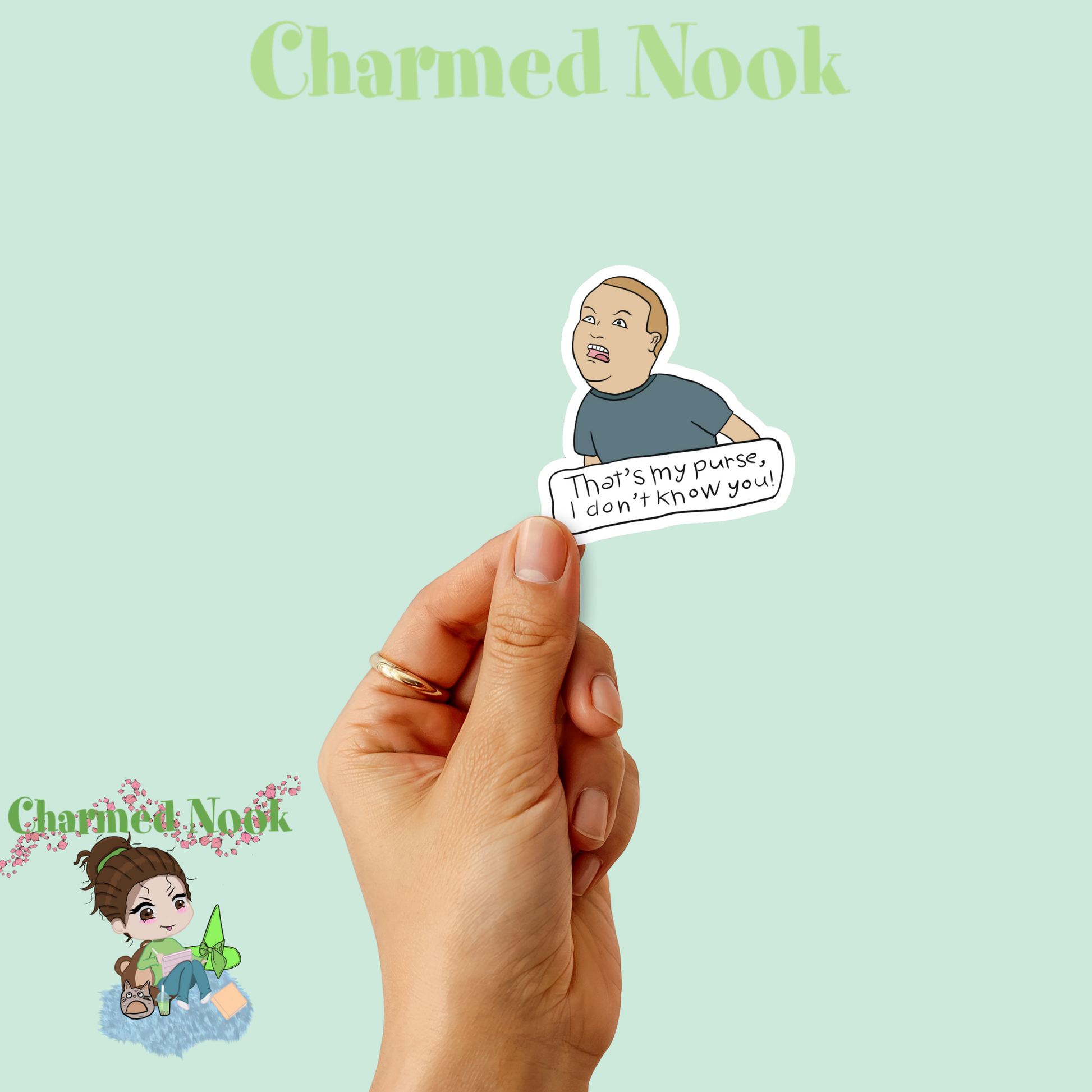 Featuring Bobby Hill in his most unrestrained goblin-screech moment, this waterproof vinyl sticker delivers the raw, chaotic, throat-chakra-activated “THAT’S MY PURSE!” energy your belongings deserve.